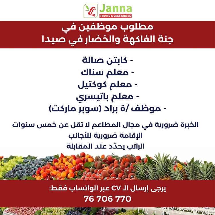 مطلوب موظفين في جنة الفاكهة والخضار في صيدا: