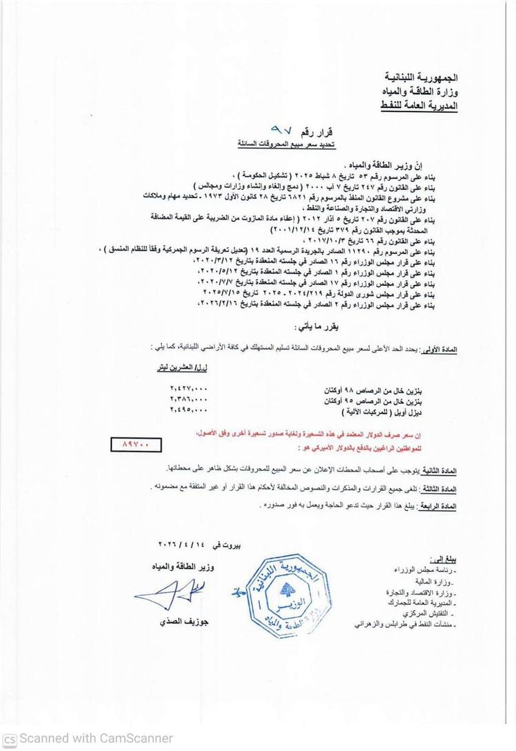 أصدرت وزارة الطاقة والمياه اللبنانية صباح اليوم الثلاثاء جدولًا جديدًا لأسعار المحروقات، مسجلًا ارتفاعًا جديدًا في مختلف الأصناف، على النحو الآتي: