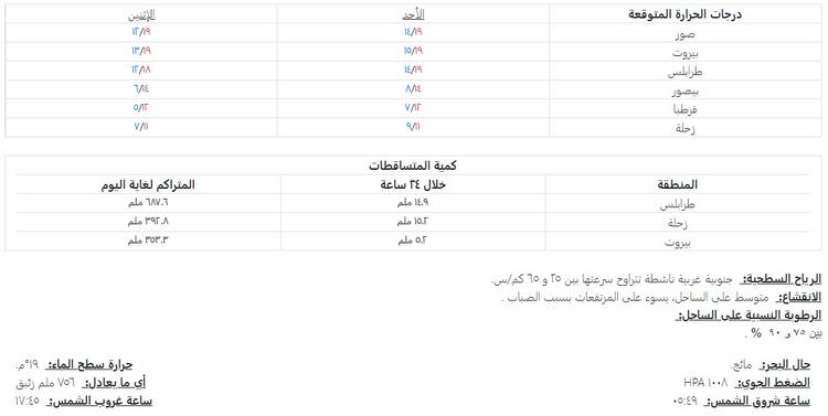 غائم الى غائم جزئياً مع ضباب على المرتفعات دون تعديل يذكر بدرجات الحرارة، تتساقط أمطار خفيفة متفرقة مع بعض الثلوج على ارتفاع ١٧٠٠ متر وما فوق، يتحسن الطقس تدريجياً اعتباراً من بعد الظهر ويتحول ليلاً الى قليل الغيوم مع أجواء باردة ليلاً وخلال ساعات الصباح الأولى لذا نحذّر من خطر الإنزلاقات على الطرقات الداخلية والجبلية التي تعلو عن ١٣٠٠متر بسبب تكوّن الجليد.