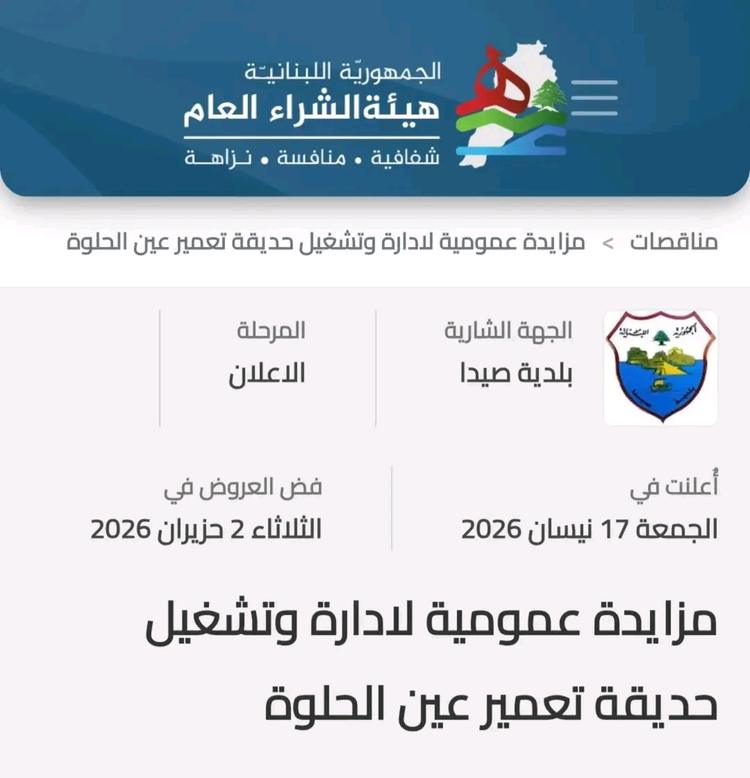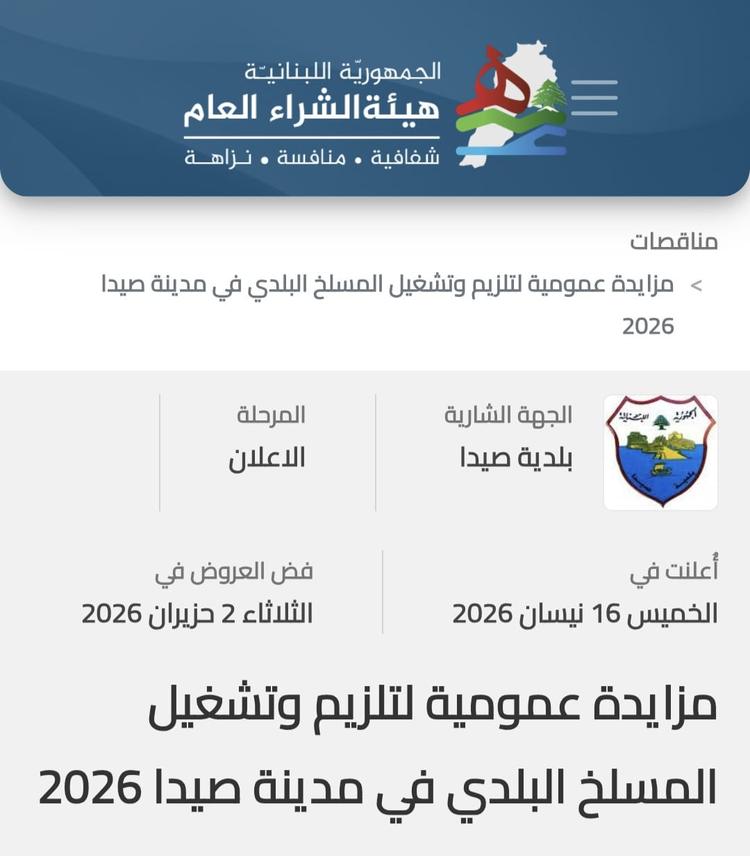 بناء عليه، تدعو بلدية صيدا كافة الشركات المتخصصة والراغبة في المشاركة بهذه المزايدة، بوجوب الاطلاع على كافة التفاصيل والشروط وتحميل المستندات المطلوبة عبر زيارة الرابط المخصص لهذه المناقصة على الموقع الإلكتروني الرسمي لهيئة الشراء العام من خلال الرابط التالي: