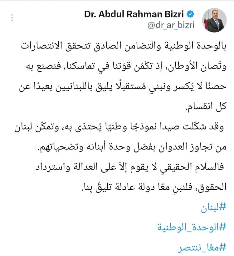 بالوحدة الوطنية والتضامن الصادق تتحقق الانتصارات وتُصان الأوطان، إذ تكْمُن قوّتنا في تماسكنا، فنصنع به حصنًا لا يُكسر ونبني مُستقبلًا يليق باللبنانيين بعيدًا عن كل انقسام.
