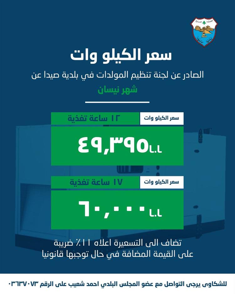- يلتزم اصحاب المولدات الكهربائية الخاصة بالتعرفة الموحدة للكيلو وات الصادرة عن وزارة الطاقة عن شهر نيسان وهي 49.395 ل.ل عن كل كيلو وات ساعة على ان لا تقل ساعات التغذية من المولد عن ١٢ ساعة يوميا، وفي حال زادت ساعات التغذية من المولد عن ١٧ ساعة يصبح السعر 60.000 ل.ل. عن كل كيلو وات ساعة تغذية مبنية على اساس سعر وسطي للدولار 89500 ل.ل.