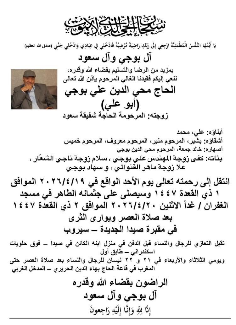 وفاة الحاج محي الدين علي بوجي (ابو علي)، الدفن عصر يوم الاثنين في 20 نيسان 2026