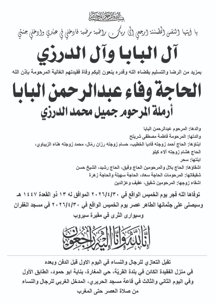 وفاة الحاجة وفاء عبدالرحمن البابا، الدفن عصر يوم الخميس في 30 نيسان 2026