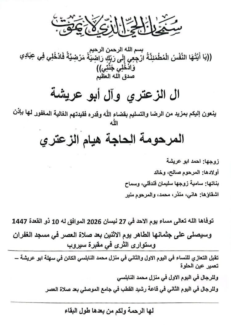 وفاة الحاجة هيام الزعتري، الدفن عصر يوم الاثنين في 27 نيسان 2026