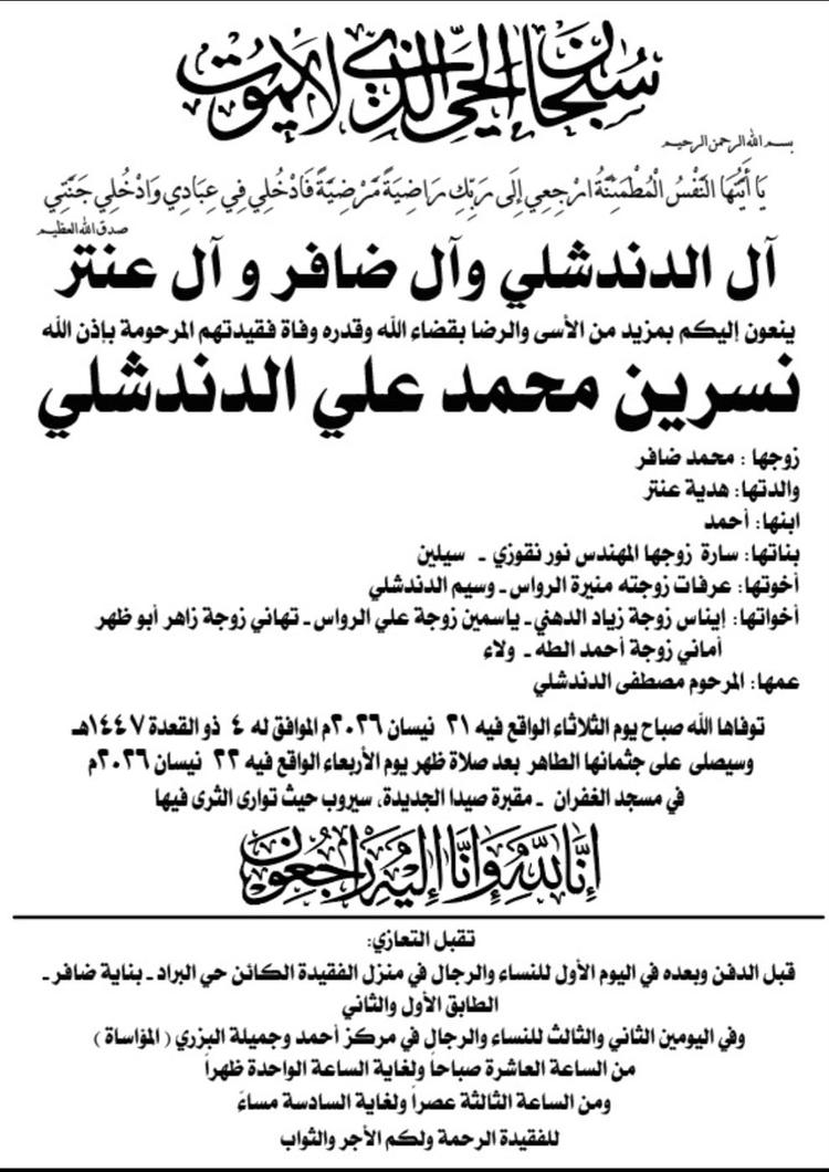 وفاة نسرين محمد علي الدندشلي، الدفن ظهر يوم الأربعاء في 22 نيسان 2026