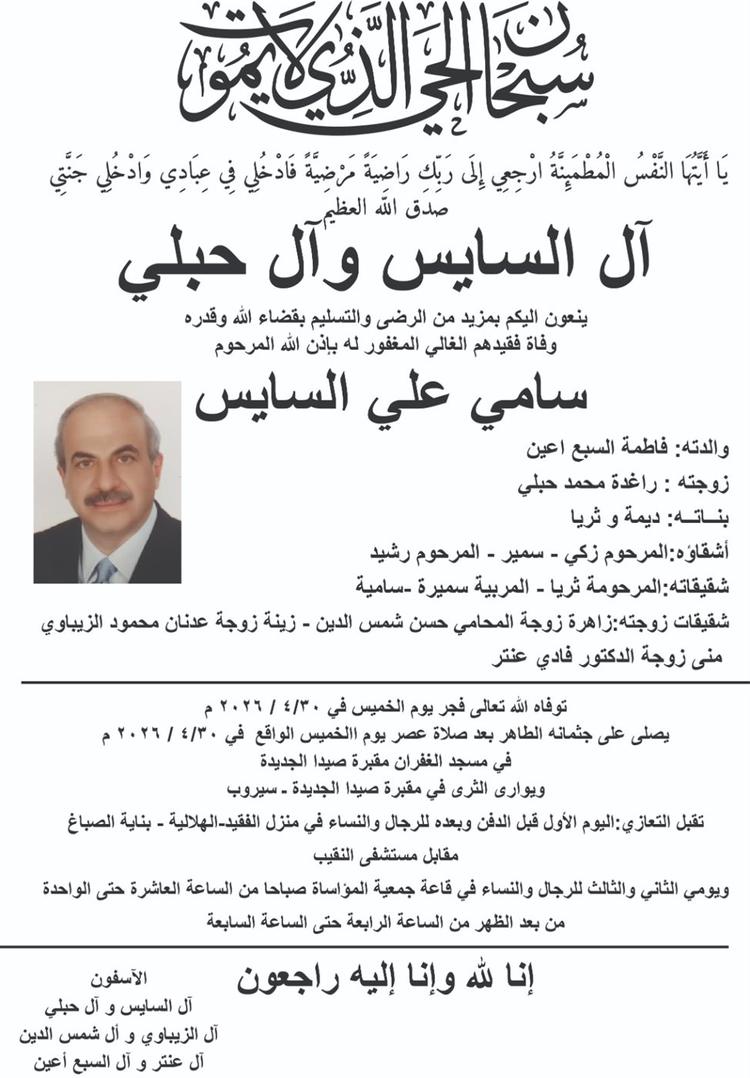 وفاة سامي علي السايس، الدفن عصر يوم الخميس في 30 نيسان 2026