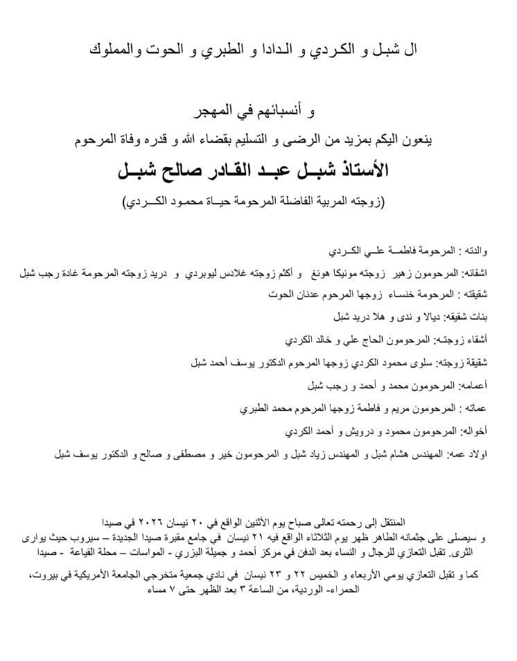 وفاة الأستاذ شبل عبدالقادر صالح شبل، الدفن ظهر يوم الثلاثاء في 21 نيسان 2026
