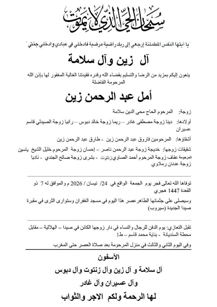 وفاة أمل عبد الرحمن الزين، الدفن عصر يوم الجمعة في 24 نيسان 2026