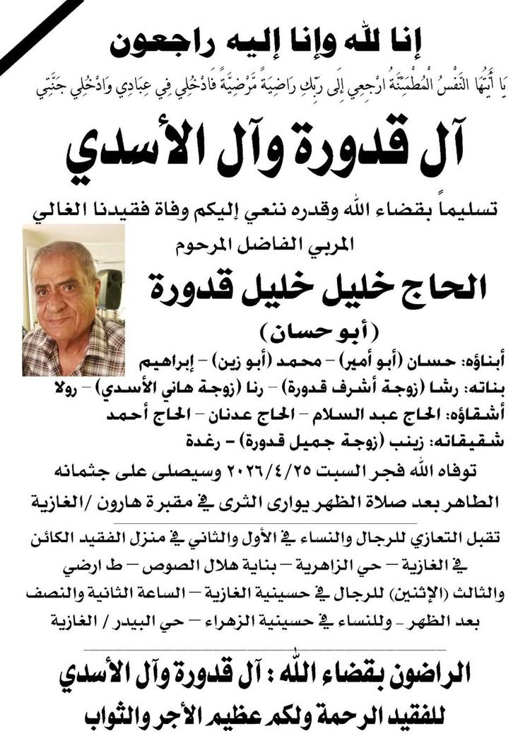 وفاة الحاج خليل خليل قدورة (ابو حسان)، الدفن ظهر يوم السبت في 25 نيسان 2026