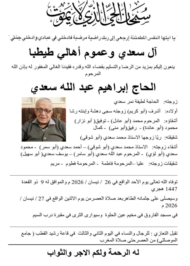 وفاة الحاج ابراهيم عبدالله السعدي، الدفن عصر يوم الاثنين في 27 نيسان 2026
