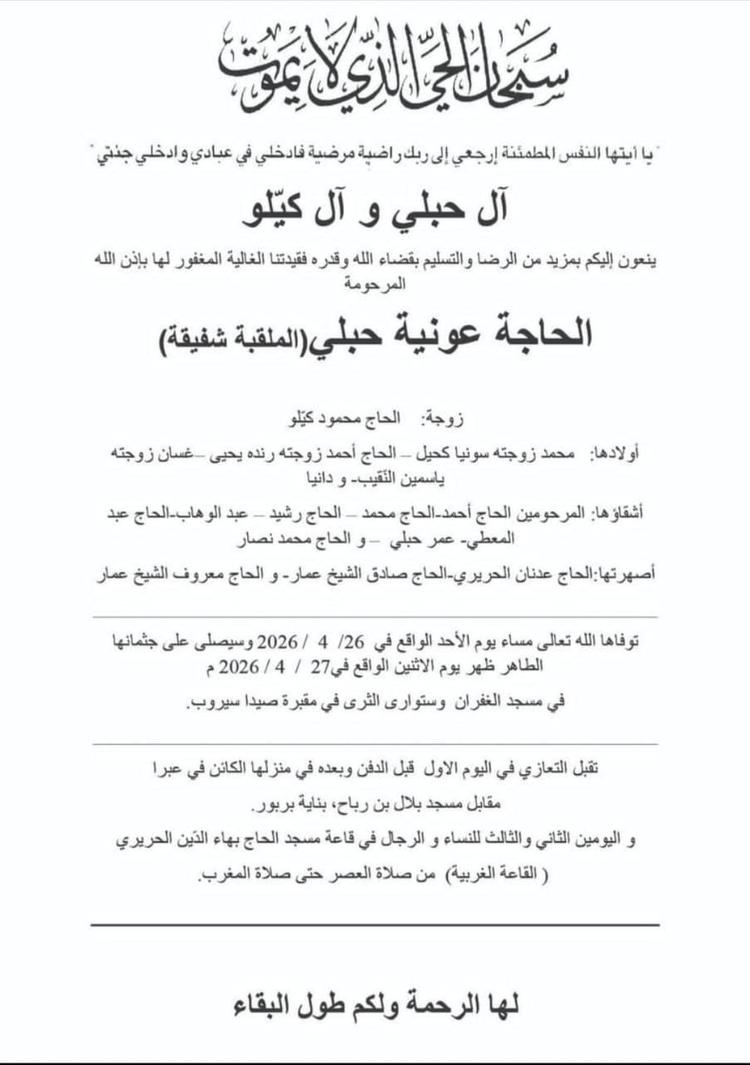 وفاة الحاجة عونية حبلي (الملقبة شفيقة)، الدفن ظهر يوم الاثنين في 27 نيسان 2026