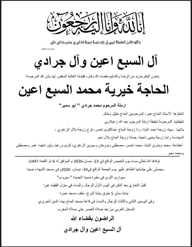 وفاة الحاجة خيرية محمد السبع اعين، الدفن ظهر يوم الجمعة في 24 نيسان 2026