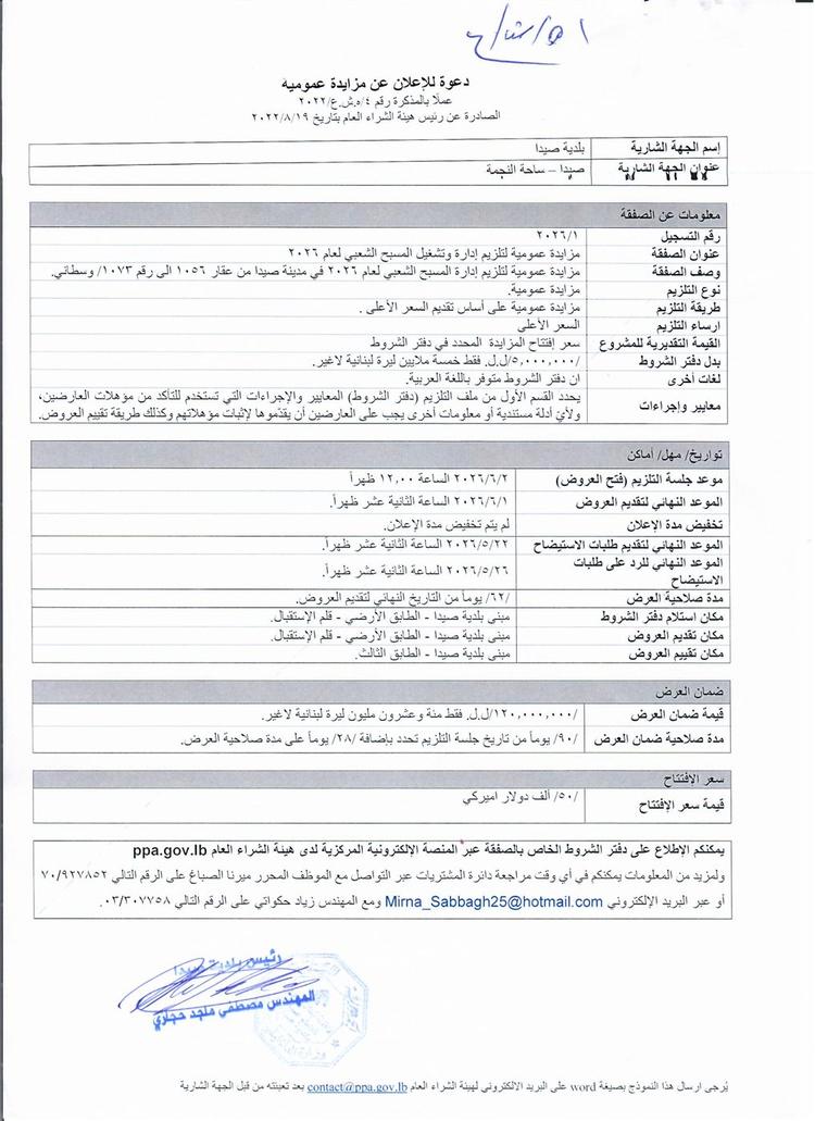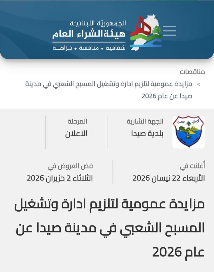 تعلن بلدية صيدا عن طرح مزايدة عمومية عبر منصة هيئة الشراء العام، تهدف الى ادارة وتشغيل مسبح صيدا الشعبي، وذلك وفقاً للمواصفات والشروط الواردة في دفتر الشروط الخاص بالصفقة، الموجود ادناه.