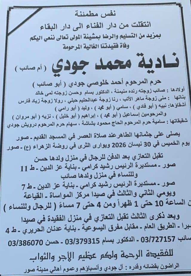 وفاة نادية محمد جودي (ام صائب)، الدفن عصر يوم الخميس في 30 نيسان 2026